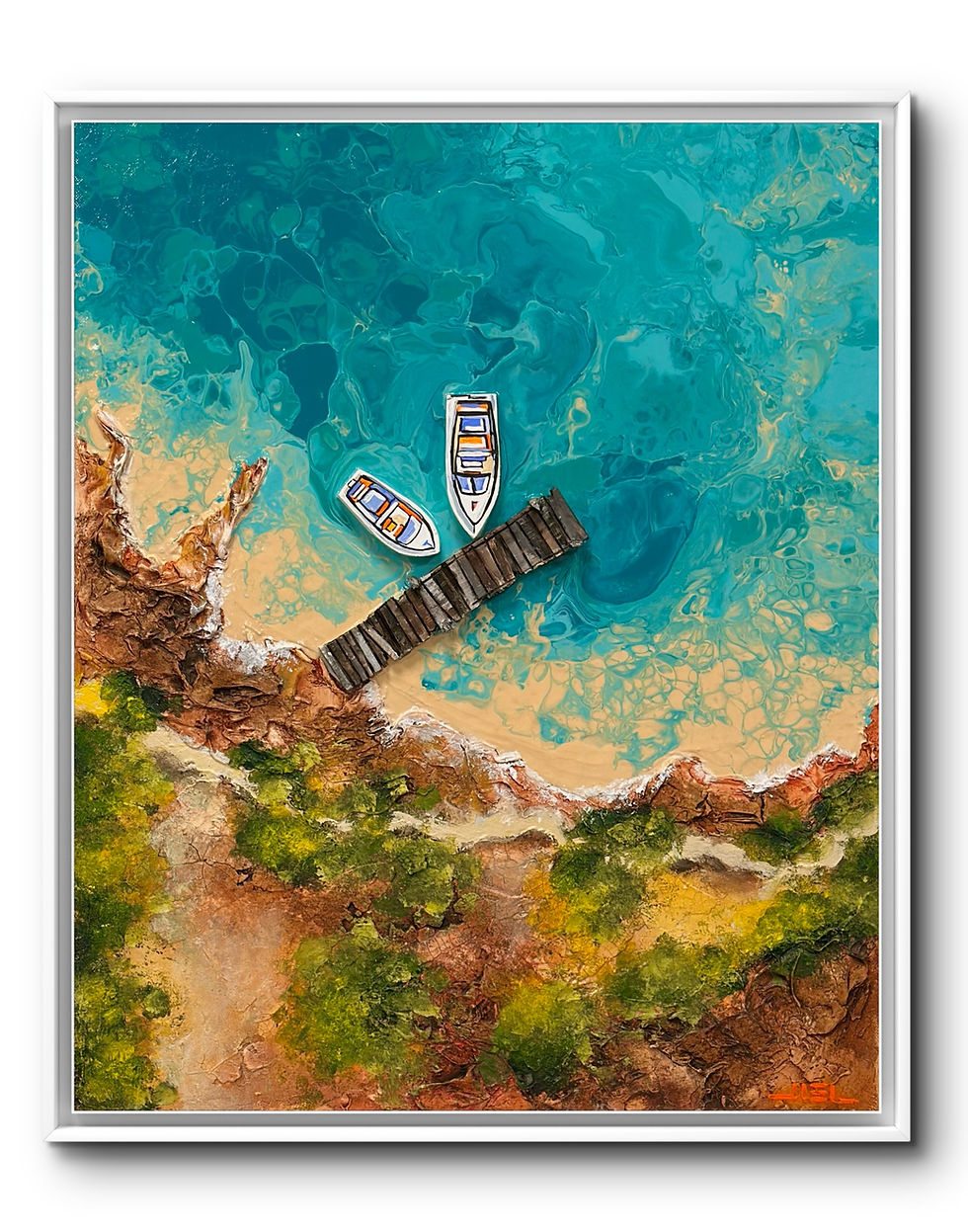 Mediterralis™ is a collection of original artworks created by artist JIEL, blending controlled acrylic pours, palette-knife textures, mineral reliefs, and reimagined aerial perspectives. Each painting captures the luminous vibration of the Mediterranean — its secret coves, colorful harbors, swirling turquoise waters, iconic cabins, and coastal landscapes shaped by wind and salt.